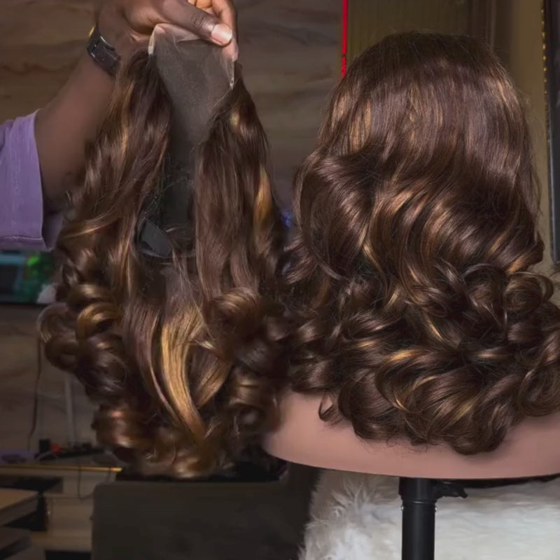 SZC Honey Blonde Brown Highlights Bouncy Body Wave 5x6 Glueless Human Hair Wig